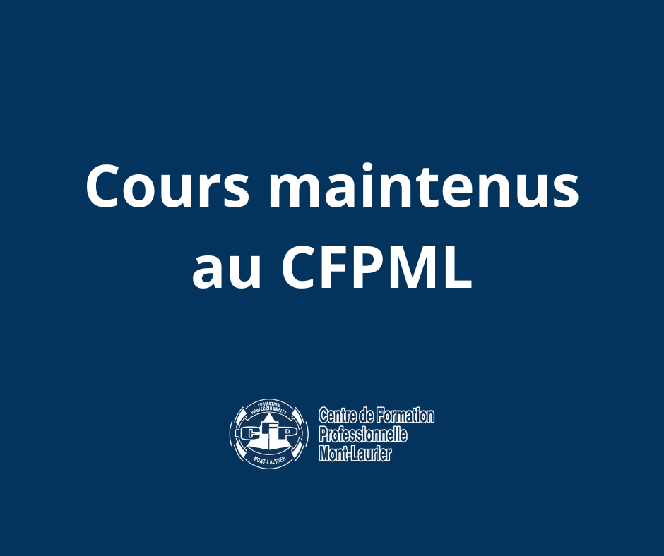 Cours maintenus au CFPML Mar 11, 2026 Ce mercredi 11 mars, veuillez noter que les cours sont maintenus pour : – l’Éducation des adultes ; – le Centre de formation professionnelle Mont‑Laurier (CFPML). De plus, les services de garde du CSSHL demeurent ouverts.