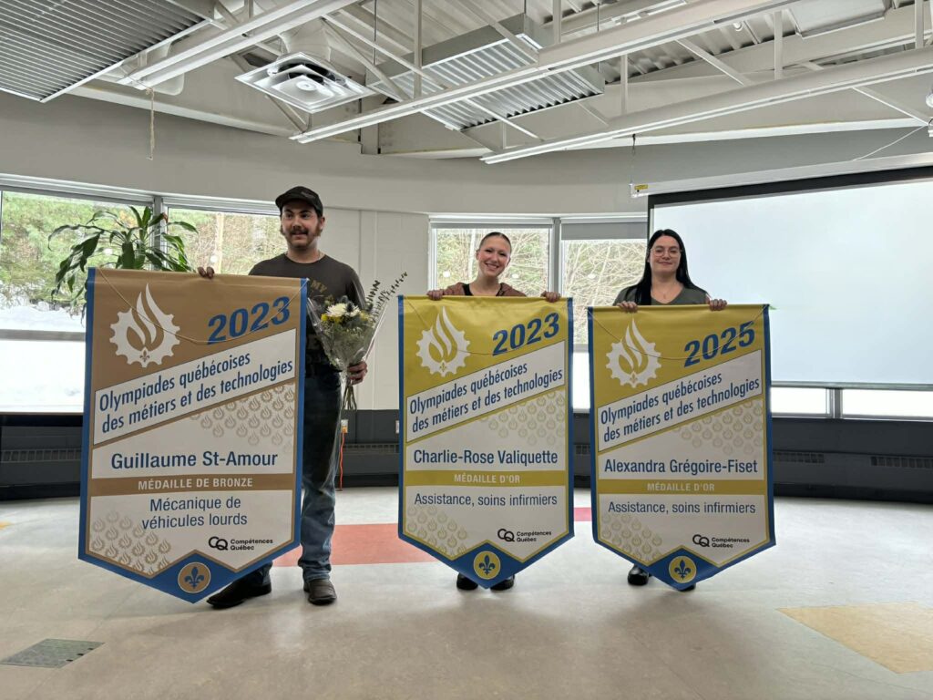 Nos lauréats devant leurs bannières : Guillaume St-Amour, médaillé de bronze 2023 en Mécanique d’engins de chantier; Charlie-Rose Valiquette, médaillée d’or 2023 en Santé, assistance et soins infirmiers et Alexandra Fiset-Grégoire, médaillée d’or 2025 en Santé, assistance et soins infirmiers.