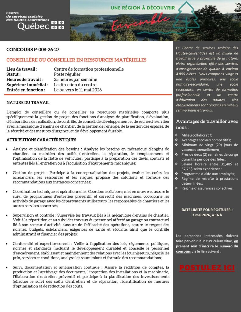 Le CFP Mont‑Laurier est à la recherche d’un(e) conseiller(ère) en ressources matérielles pour joindre son équipe!